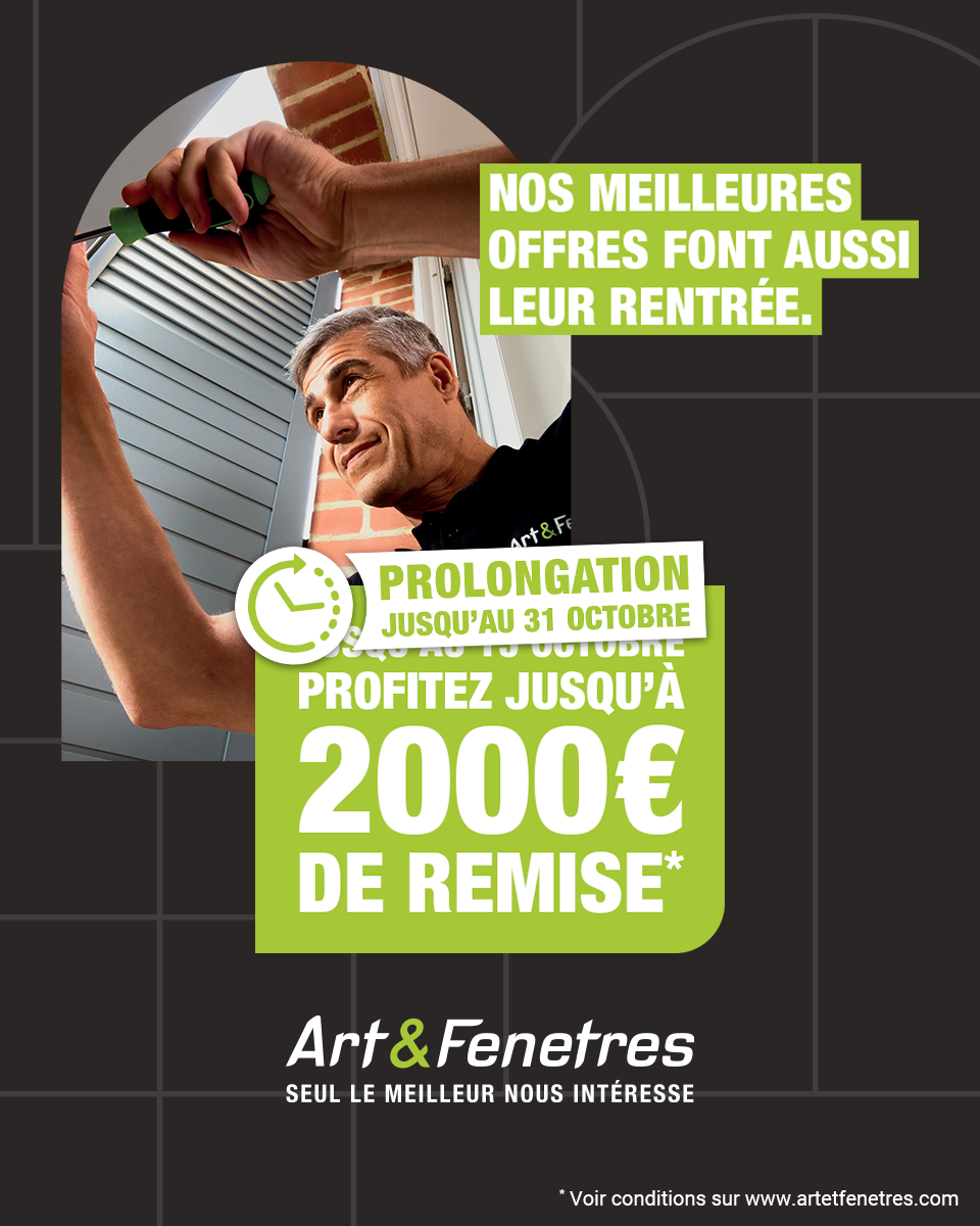 Jusqu’au 31 octobre 2025, profitez d’une remise pouvant aller jusqu’à 2000 € sur vos menuiseries Art & Fenêtres.